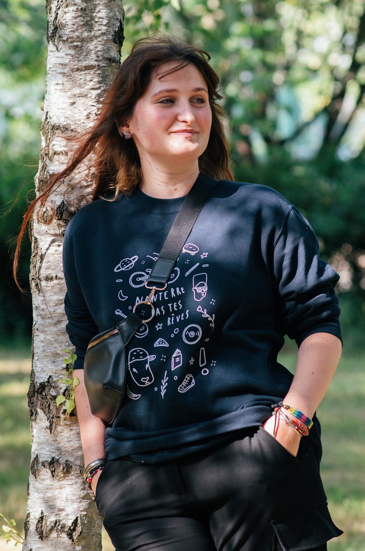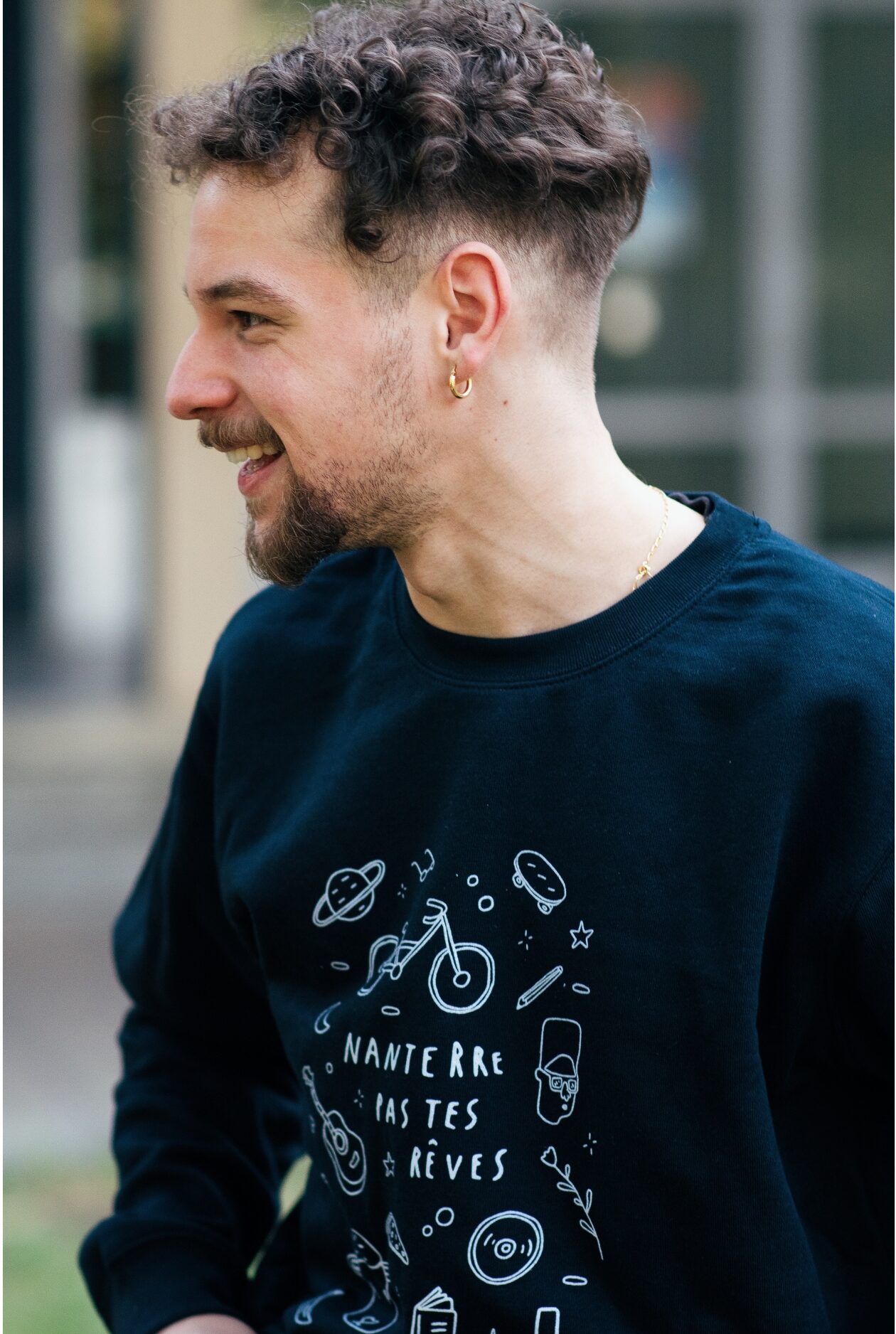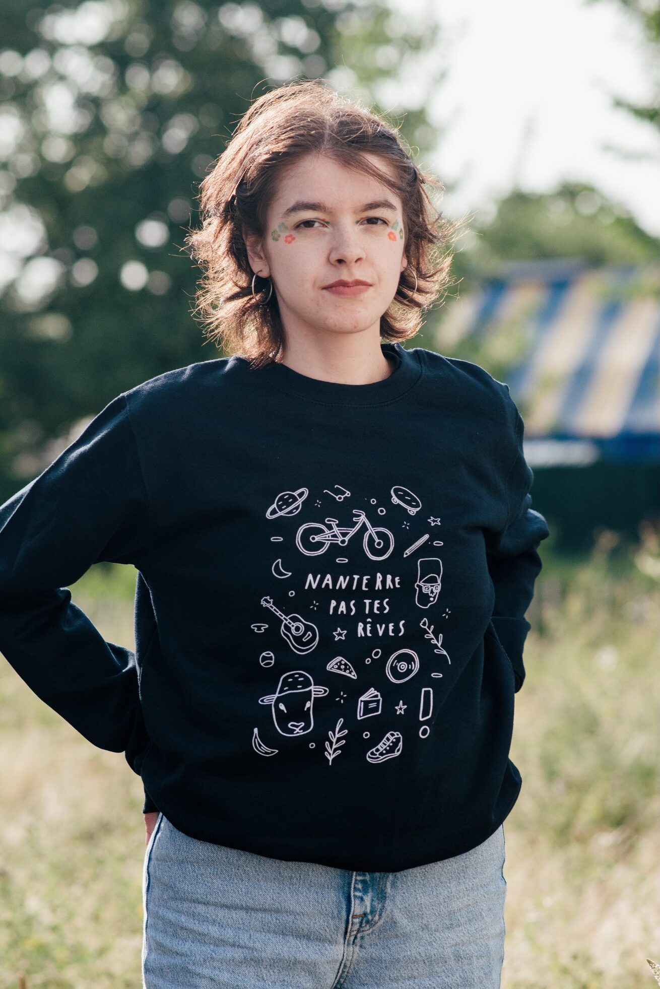 Sweat-shirt unisexe à col rond bleu marine, avec le visuel “Nanterre pas tes rêves”.